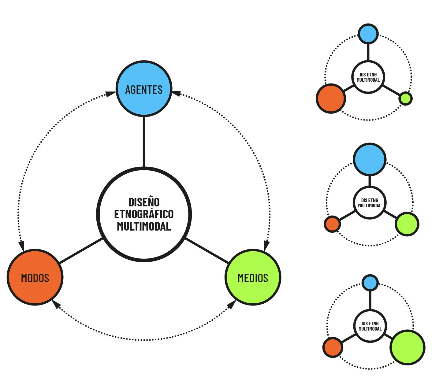 Entendemos la multimodalidad no como un subproducto del trabajo de campo ni como el material divulgativo que pueda surgir de los datos recolectados. Más bien, concebimos la multimodalidad como un proceso experimental presente en todas las etapas de la investigación (diseño, recolección de información, procesamiento y difusión de datos), que utiliza los recursos, la tecnología y la información disponibles como una apuesta epistemológica, metodológica y formal en la construcción del conocimiento. Este enfoque teje de manera holística al menos tres dimensiones interrelacionadas: agentes, modos y medios.