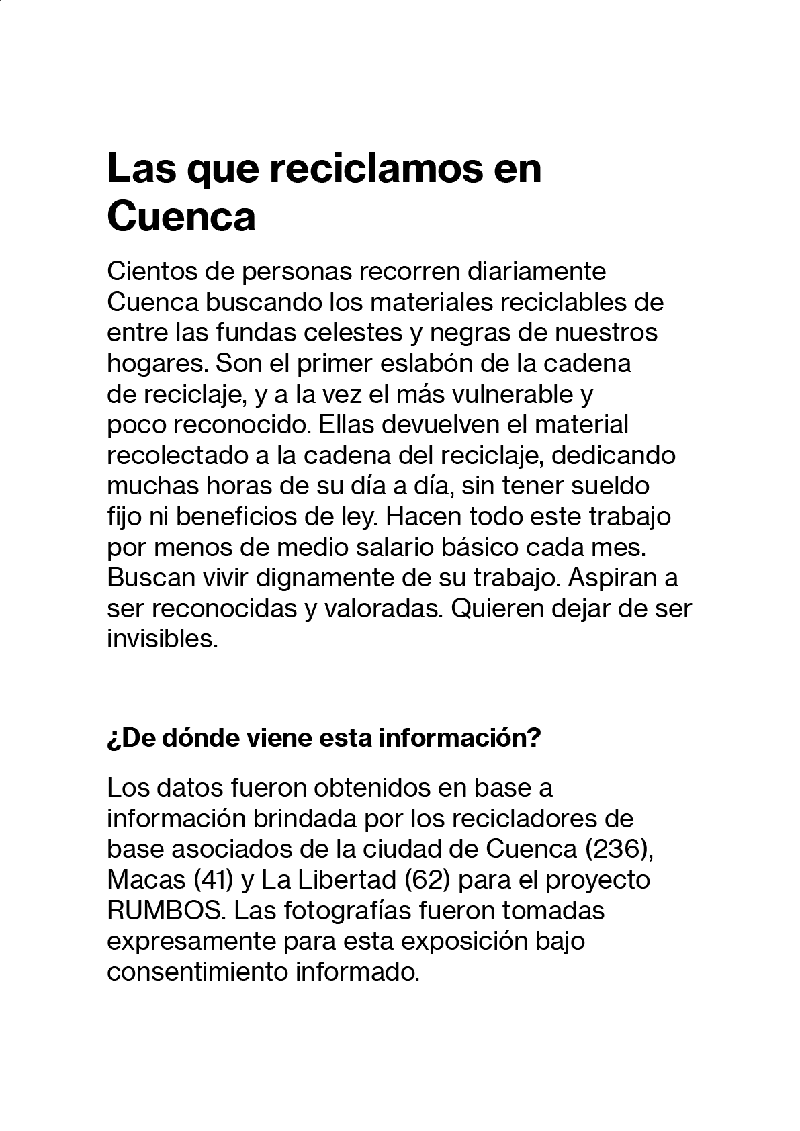Al caminar entre las decenas de recicladoras, los datos se entrelazaban con sus cuerpos, poniéndole rostro a quienes ejecutan este trabajo todos los días: mujeres (78 %), de entre 40 y 79 años (79 %), que recogen más de 100 kilos al día; recorren entre 4 y 10 kilómetros, llegando incluso hasta 16; y su ingreso mensual promedio es de 145 dólares. El 36 % vive en zonas rurales, aunque el reciclaje se realizaba mayormente en áreas urbanas.