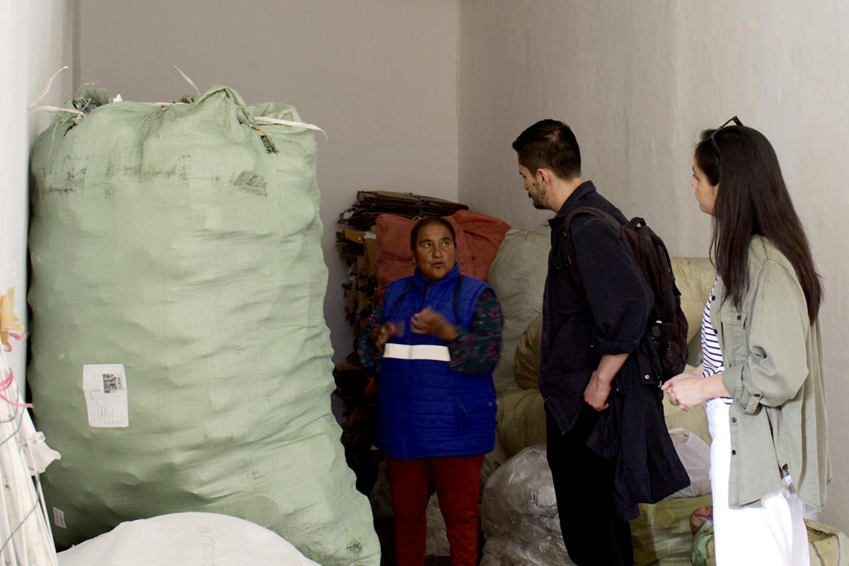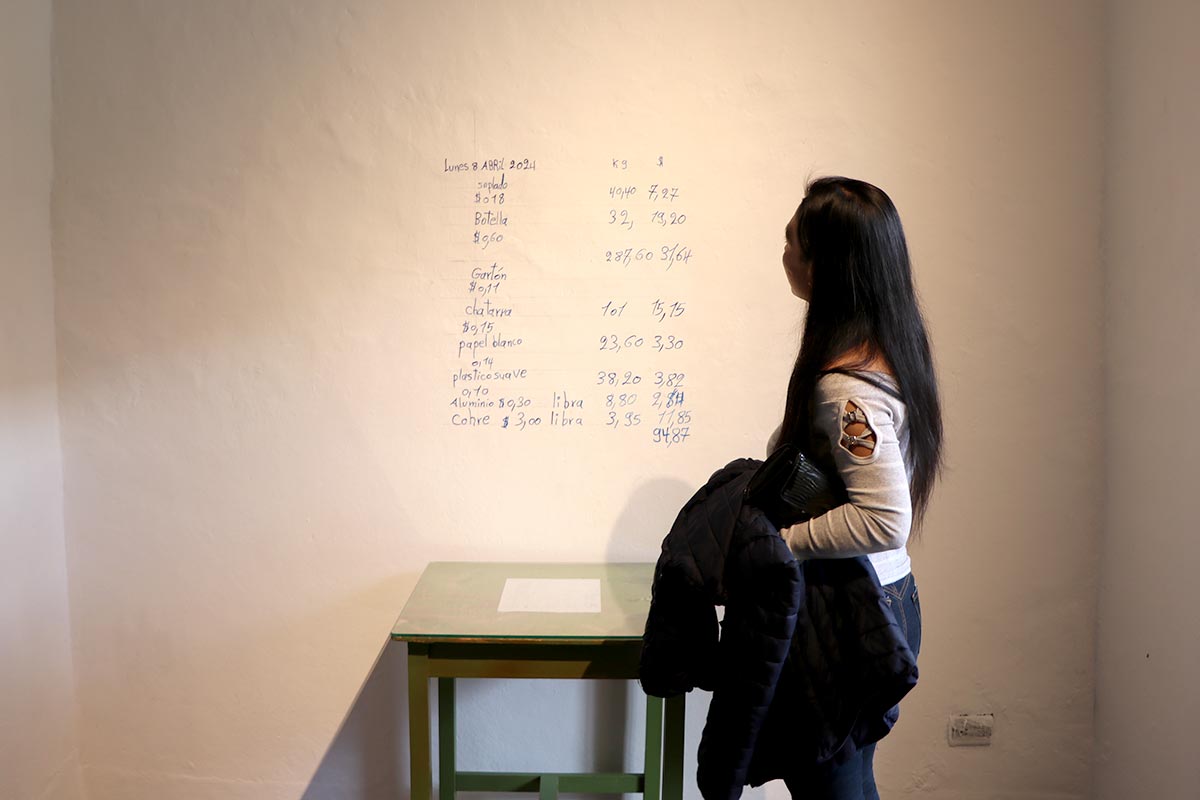 Para representar esta realidad, se recreó una bodega que simulaba una semana de recolección efectuada por una pareja de recicladores. Construida íntegramente entre los dos, esta sala sumergió al visitante en las dinámicas de acopio del material y su preparación para la posterior comercialización, destacando cómo el peso, los precios y la frecuencia de venta variaban según las dinámicas de cada recicladora.